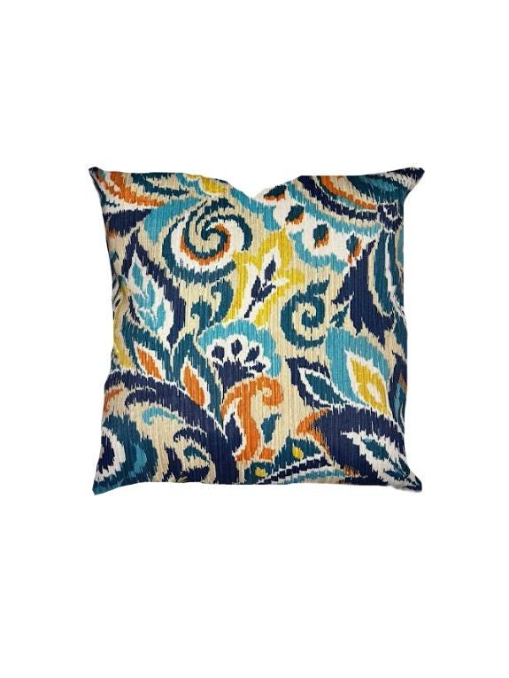 Pillow Cover, Paisley Sun Yellow Turquoise Blue Apricot Orange Navy Blue, 16x16 inches, Outdoor and Indoor