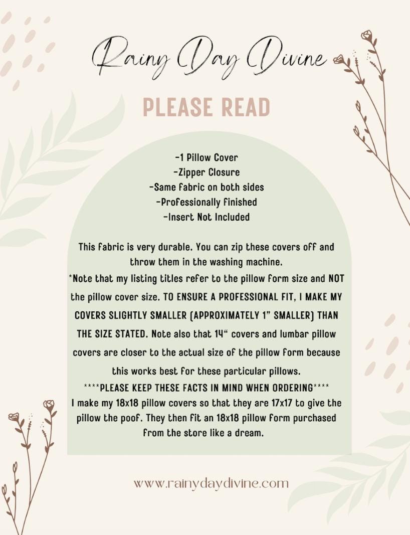 *Note that my listing titles refer to the pillow form size and NOT the pillow cover size. TO ENSURE A PROFESSIONAL FIT, I MAKE MY COVERS SLIGHTLY SMALLER (APPROXIMATELY 1” SMALLER) THAN THE SIZE STATED. Note also that 14" covers and lumbar pillow covers are closer to the actual size of the pillow form because this works best for these particular pillows.