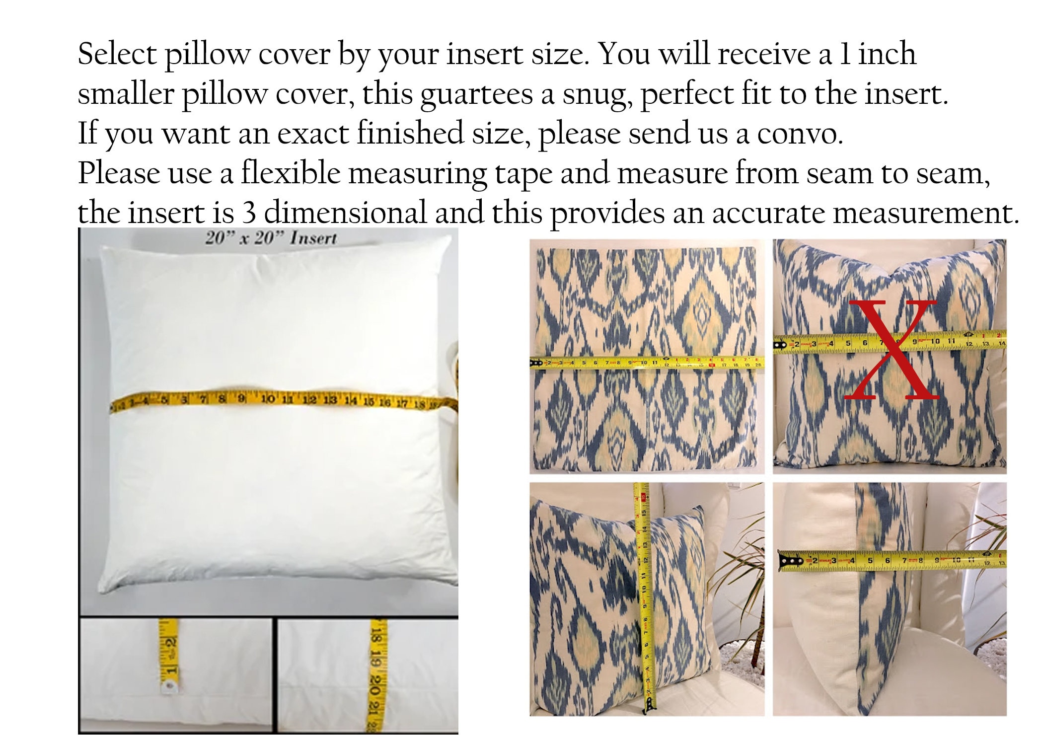 ** ~Note that my listing titles refer to the pillow form size and NOT the pillow cover size. TO ENSURE A PROFESSIONAL FIT, I MAKE MY COVERS SLIGHTLY SMALLER (APPROXIMATELY 1” SMALLER) THAN THE SIZE STATED. Note also that 14" covers and lumbar pillow covers are closer to the actual size of the pillow form because this works best for these particular pillows. ****PLEASE KEEP THESE FACTS IN MIND WHEN ORDERING**** You may contact me if your specific needs call for a custom size. I make my 18x18 pillow covers so that they are 17x17 to give the pillow the poof. They then fit an 18x18 pillow form purchased from the store like a dream.All inside edges are treated to prevent fraying, and stress points are triple stitched.